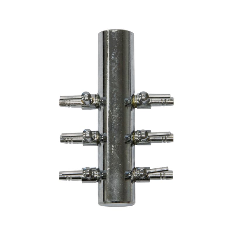 Répartiteur en acier inoxydable avec robinets pour distribuer l'air sur plusieurs sorties. Fabriqué en acier inoxydable, il ne rouille pas et est durable. Entrée 18mm, les vannes se connectent à un tuyau à air de Ø 4/6mm.