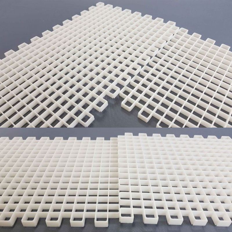 Les grilles peuvent être raccordées entre elles grâce a un système de à rainure et languette, permettant ainsi de créer la surface désirée.