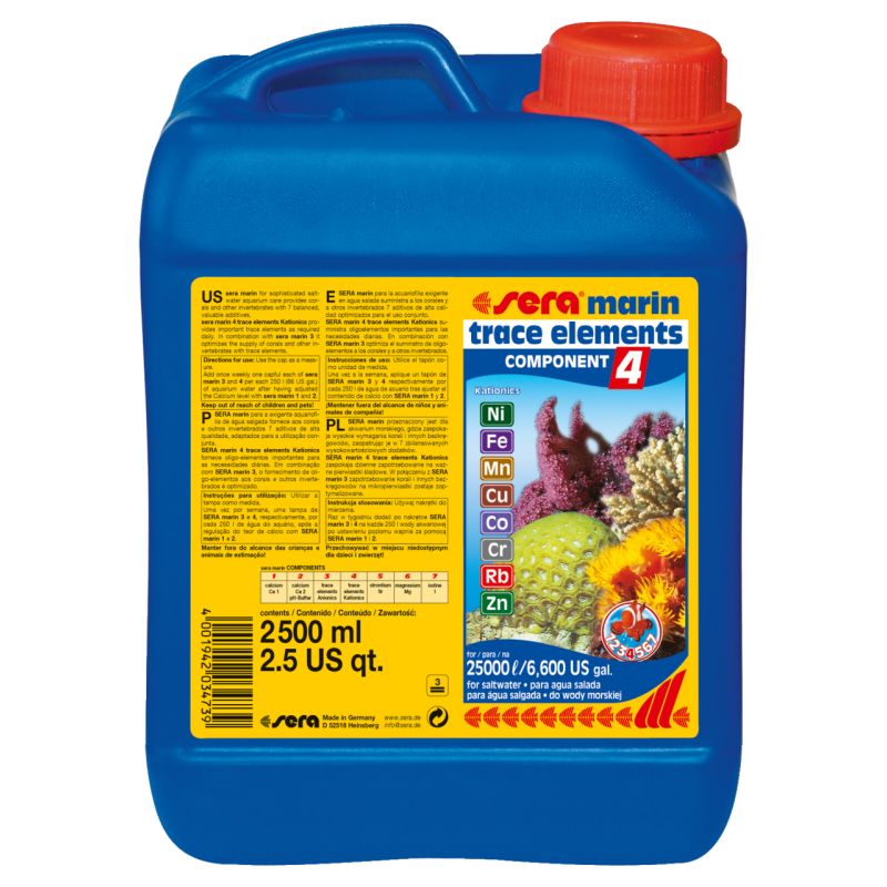 Une fois par semaine, un bouchon de sera marin 3 et 4 respectivement pour 100 l d’eau d’aquarium après avoir ajusté la teneur en calcium avec sera marin 1 et 2.
