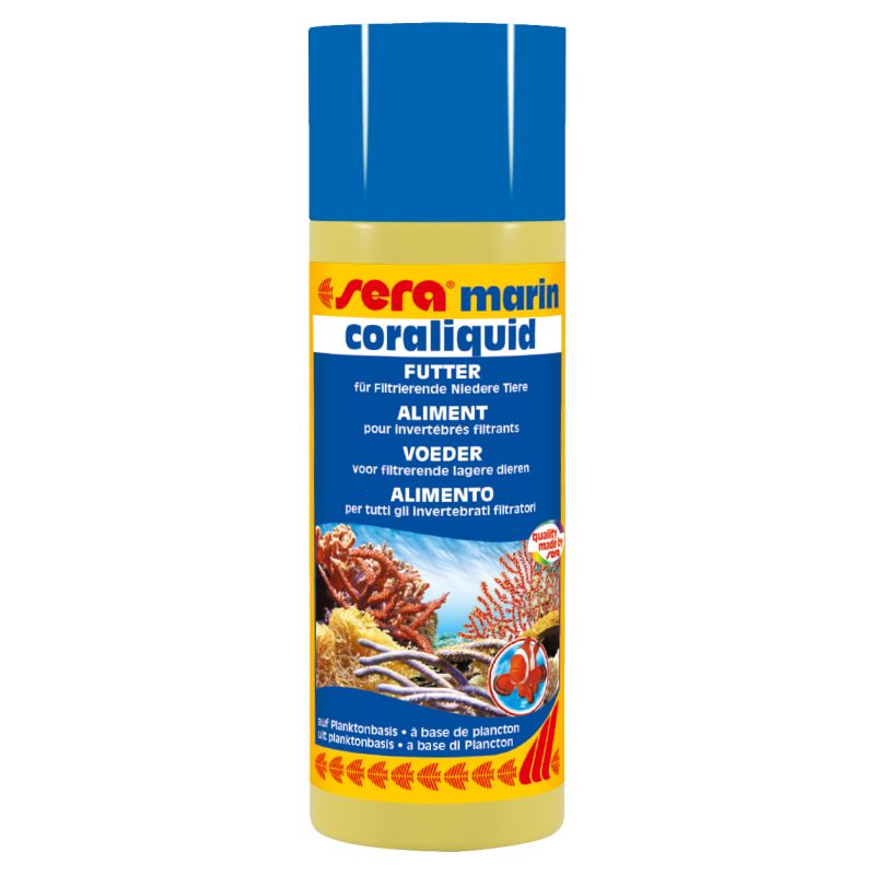 Donner 1 à 2 fois par semaine 5 ml de sera marin Coraliquid pour 200 l d’eau. Avant le nourrissage, désactiver les pompes, le filtre et l’écumeur et réactiver après 15 min.