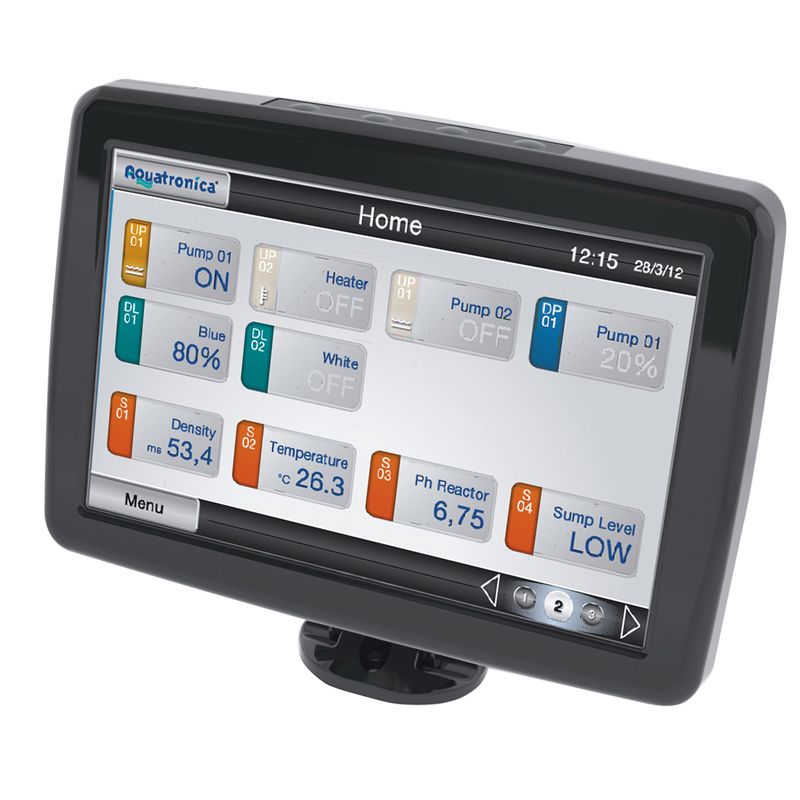 L'Aquatronica "Touch Controller" est une unité de contrôle innovante munie d'un écran tactile de 7'' et d'un design élégant. Son large écran tactile facilite la programmation et permet l'affichage de graphiques clairs. Grâce au "Touch controller", l'utilisateur peut vérifier les paramètres chimiques de son aquarium et peut configurer aisément des programmes pouvant contrôler les différents appareils connectés au système (pompes, chauffages, etc).