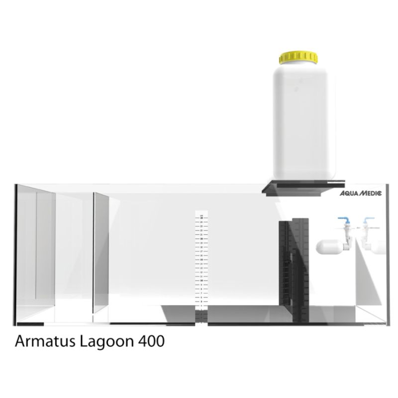 Filtre en verre intégré dans le meuble de support avec chambre de pré-filtration, deux chambres d'eauclaire pour un positionnement libre de filtres mécaniques et biologiques (par ex. écumeur, multi reactor etc.) ainsi que de médias filtrants.