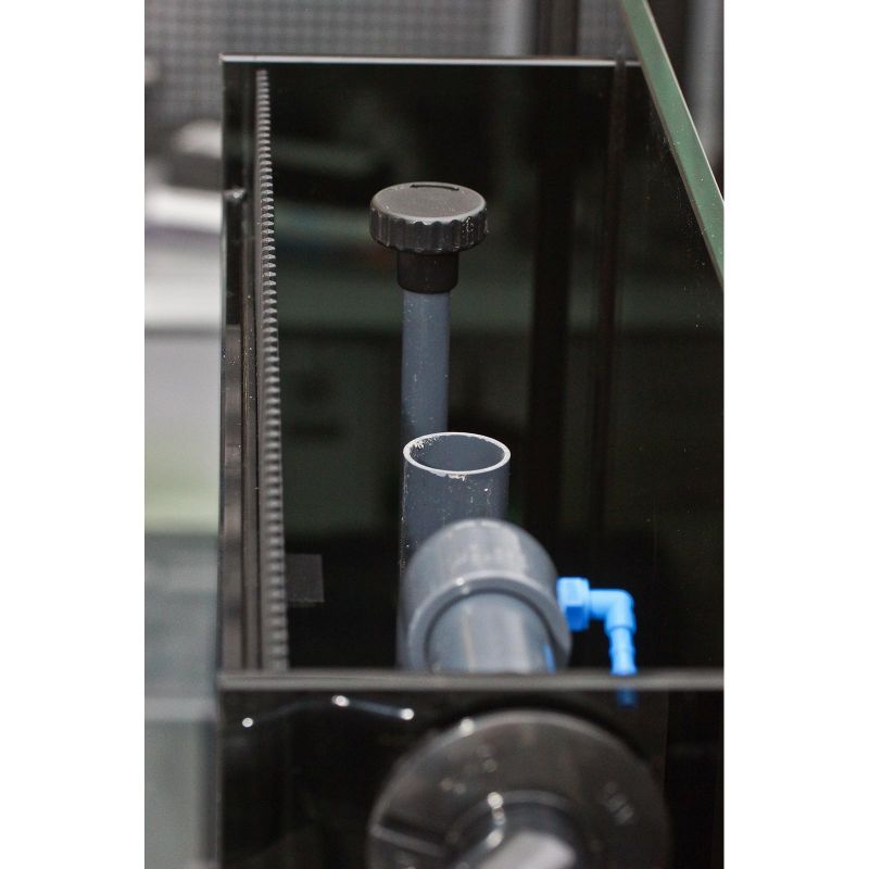 Filtre en verre avec chambre de pré-filtration, deux compartiments d'eau filtrée pour l’installation d'un filtre biologique et d'un filtre mécanique (par exemple écumeur, multi reactor etc.) ainsi que du substrat de filtration.