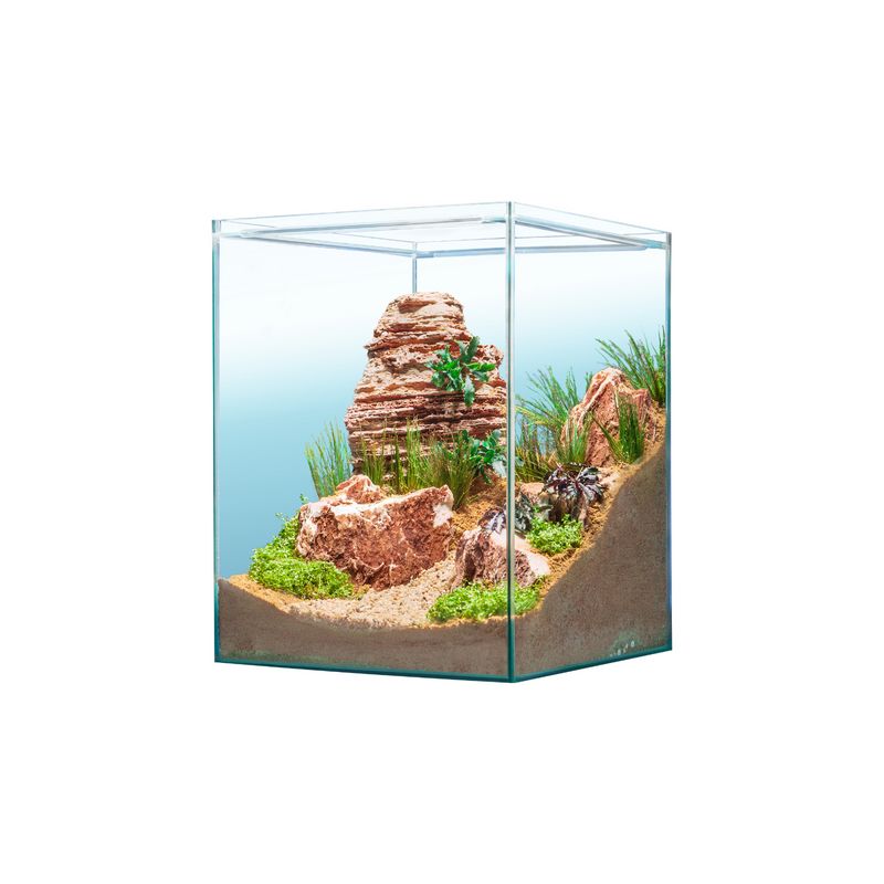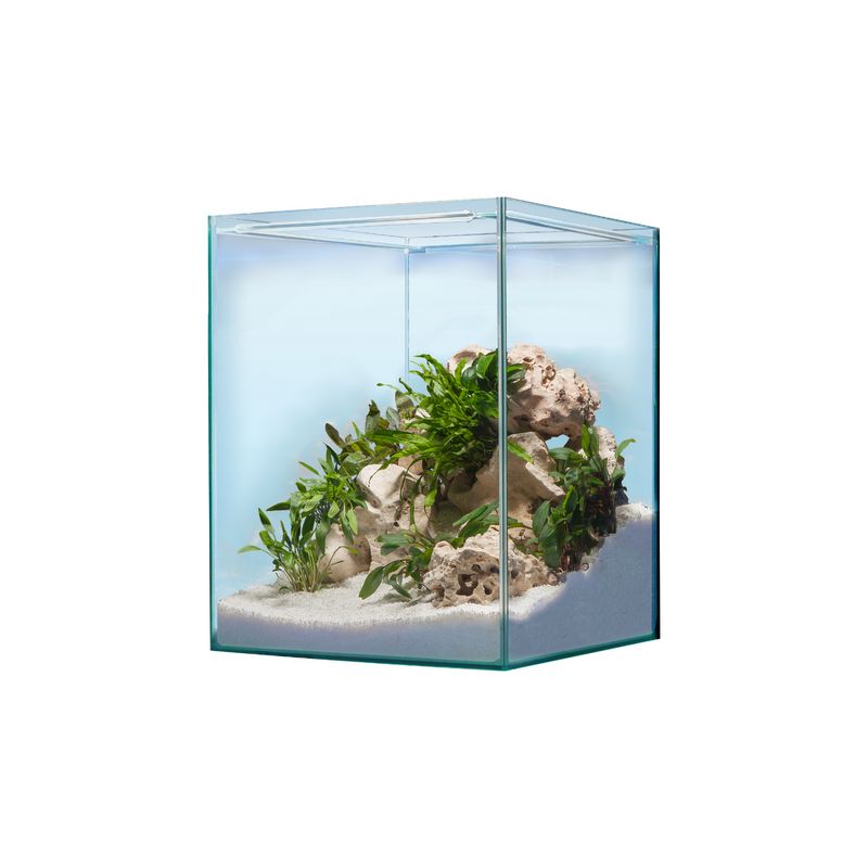 Sur une surface de base de 40 x 40 cm, on peut recréer ou concevoir soi-même différents mondes sous-marins dans le sera Scaper Cube – il n’y a aucune limite à la créativité. Comme l’aquarium n’a pas besoin de couvercle, même les grosses racines ou pierres qui dépassent de l’aquarium y trouvent leur place. Grâce aux barres de sécurité situées à à environ 1 cm sous le bord du verre, le risque que les poissons sautent ou que les crevettes sortent en rampant est considérablement réduit.