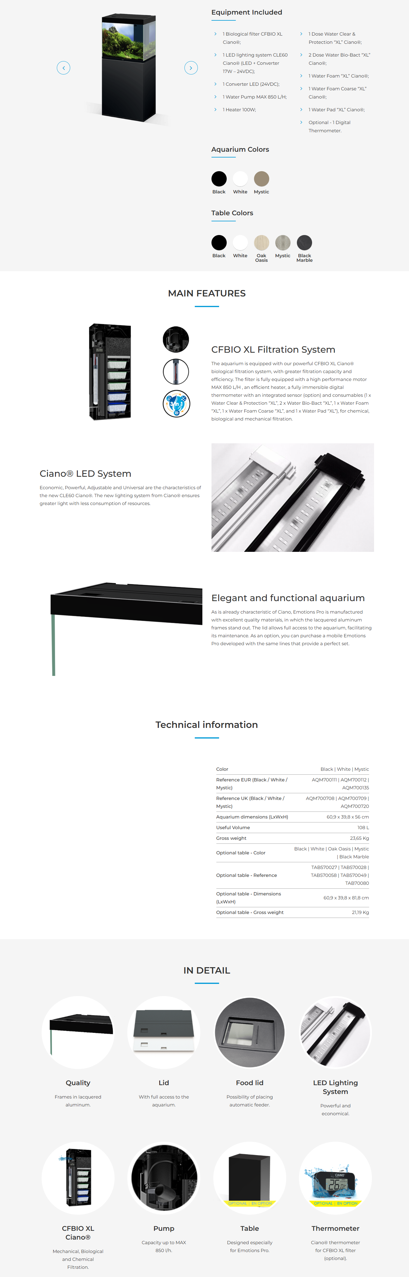 L'aquarium Emotions Pro est fabriqué avec des matériaux d'excellente qualité, notamment des cadres en aluminium laqué. Son couvercle permet un accès complet à l'aquarium, facilitant ainsi son entretien. En option, une version mobile Emotions Pro, conçue dans le même esprit, est disponible pour un ensemble harmonieux.