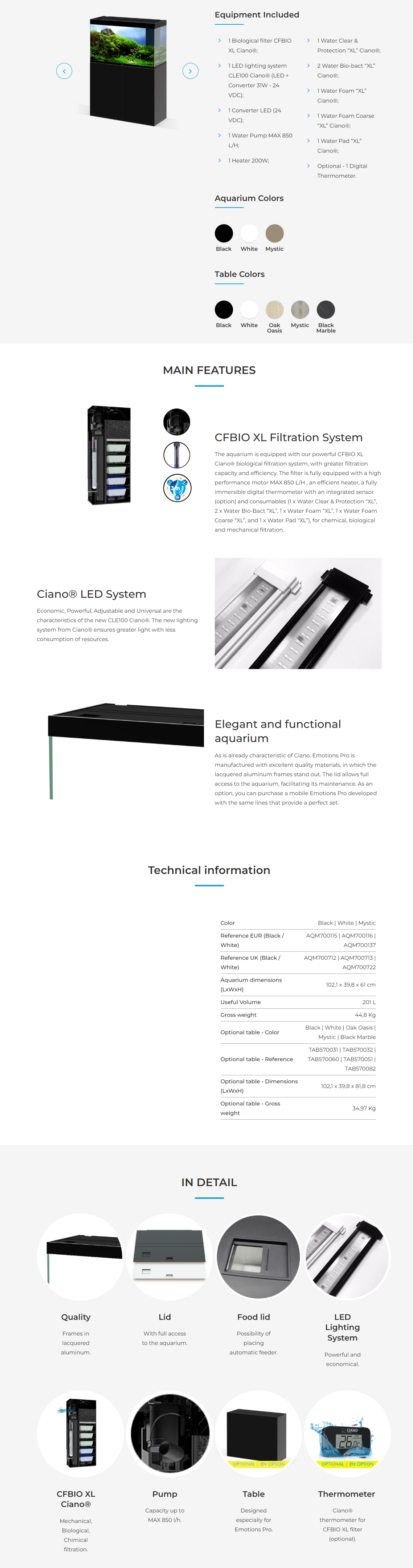 L'aquarium est équipé de notre puissant système de filtration biologique CFBIO XL Ciano®, offrant une capacité et une efficacité de filtration supérieures. Le filtre est entièrement équipé d'un moteur haute performance MAX 850 L/h, d'un chauffage efficace, d'un thermomètre numérique entièrement submersible avec capteur intégré (en option) et de consommables (1 x Water Clear & Protection « XL », 2 x Water Bio-Bact « XL », 1 x Water Foam « XL », 1 x Water Foam Coarse « XL » et 1 x Water Pad « XL »), pour une filtration chimique, biologique et mécanique.