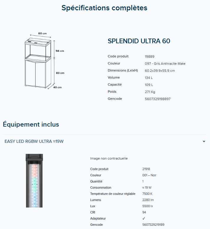 La gamme Splendid Ultra a subi des mises à jour importantes pour devenir une option plus accessible, sans compromettre ses normes de qualité élevées. Elle propose désormais quatre options de couleurs pour les aquariums, dont une nouvelle finition anodisée qui s'harmonise parfaitement avec les tons bois des meubles, qui ont également été modernisés avec une teinte bois actuelle. Pour enrichir la gamme, deux nouveaux modèles (anciennement Volga) ont été ajoutés pour mieux répondre aux besoins des clients.