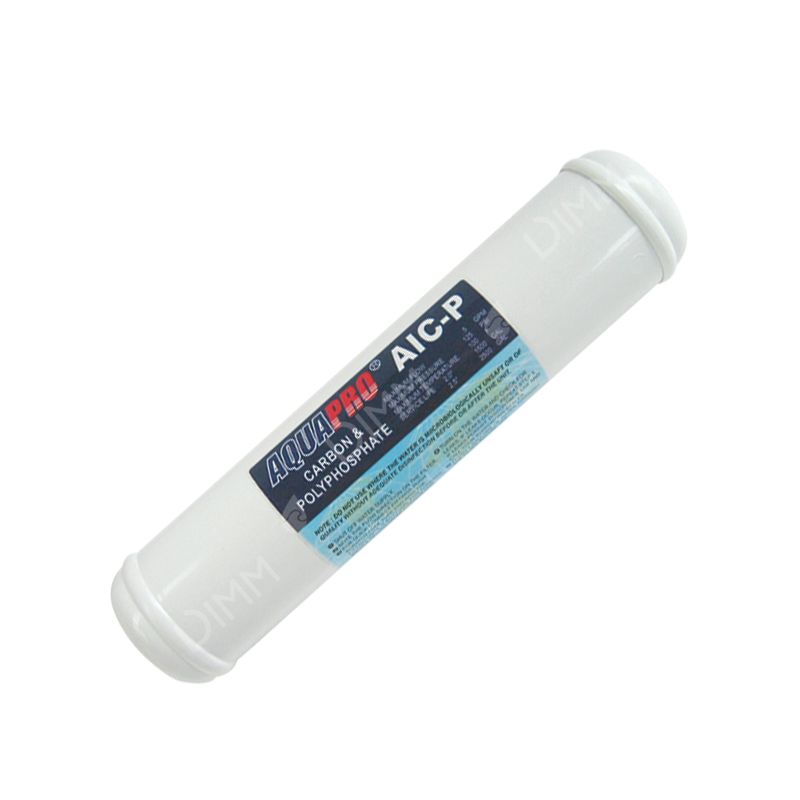 Aquapro : Cartouche en ligne charbon actif granulé (GAC) + polyphosphates - 10'' x 2'' - entrée et sortie 1/4'' - débit maximal 0,75 GPM - pression de travail maximale 8 bar - température de travail maximale 37°C - durée de vie 1000 gallons.