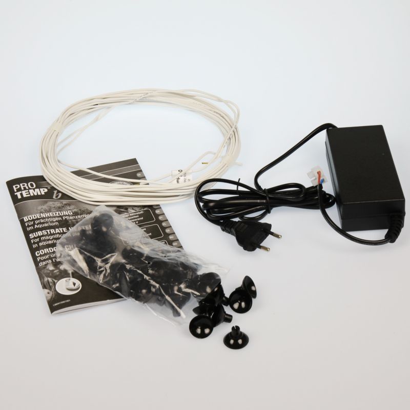 Compris dans la livraison : cordon de sol chauffant 60 W pour aquarium avec transfo électronique, câble chauffant de 9 m, 2 conducteurs froids de 2,5 m, 40 ventouses de fixation.