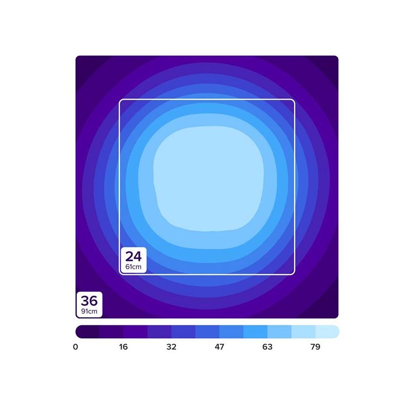 Compacte et puissante, cette LED consomme 59 W à pleine puissance et est compatible avec une entrée universelle 100-240 VAC. Ses dimensions sont 12,4 × 12,4 × 3,4 cm pour un poids de 0,43 kg, avec un câble de 6,1 m pour une installation flexible. Conforme aux normes UL, CE et RoHS.