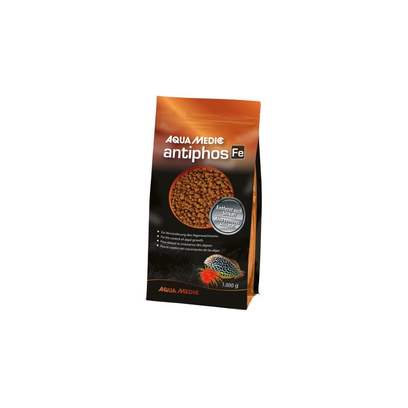 antiphos Fe retire les phosphates et silicates de l’eau et empêche ainsi la croissance des algues non souhaitées. antiphos Fe est basé sur un concentré de fer et exempt d’aluminium extrêmement efficace, absolument inoffensif pour les plantes et les animaux. antiphos Fe constitue le substrat idéal pour la réduction des phosphates présents dans les aquariums récifaux. antiphos Fe est capable de fixer environ 10 g phosphates/kg. 500 ml suffisent durant 3 à 6 mois pour un aquarium de 300 l ayant une charge normale.