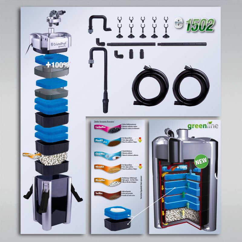 Contenu : système de filtre extérieur pour aquarium, JBL CristalProfi e1502 greenline, tuyaux, tubes 16/22, crépine d'aspiration, coudes, ventouses, masses filtrantes (billes et mousse biofiltration), dim. (L/H/l) : 200x235x475 mm