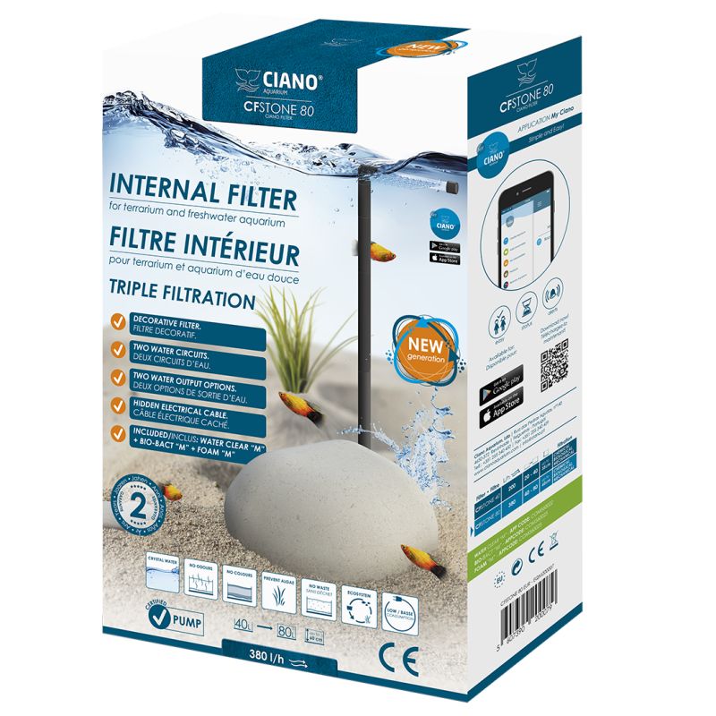 Le filtre CFSTONE80 Ciano® est une nouvelle génération de filtre intérieur. Son design en forme de pierre lui permet de se fondre dans la décoration de l'aquarium. C'est un système de filtration haute performance, facile à installer et nécessitant peu d'entretien. Ses deux circuits d'eau indépendants garantissent la propreté, le traitement de l'eau et assurent la colonisation des bactéries. Idéal pour les aquariums de 40 à 80 litres avec une hauteur maximale de 60 cm.