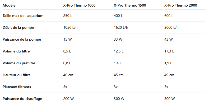 Consommation électrique 33W, capacité de la pompe 1620 L/h, chauffage 300W, pour les aquariums jusqu'à 400 litres. Capacité du 12,5L, taille du tuyau 16/22 mm