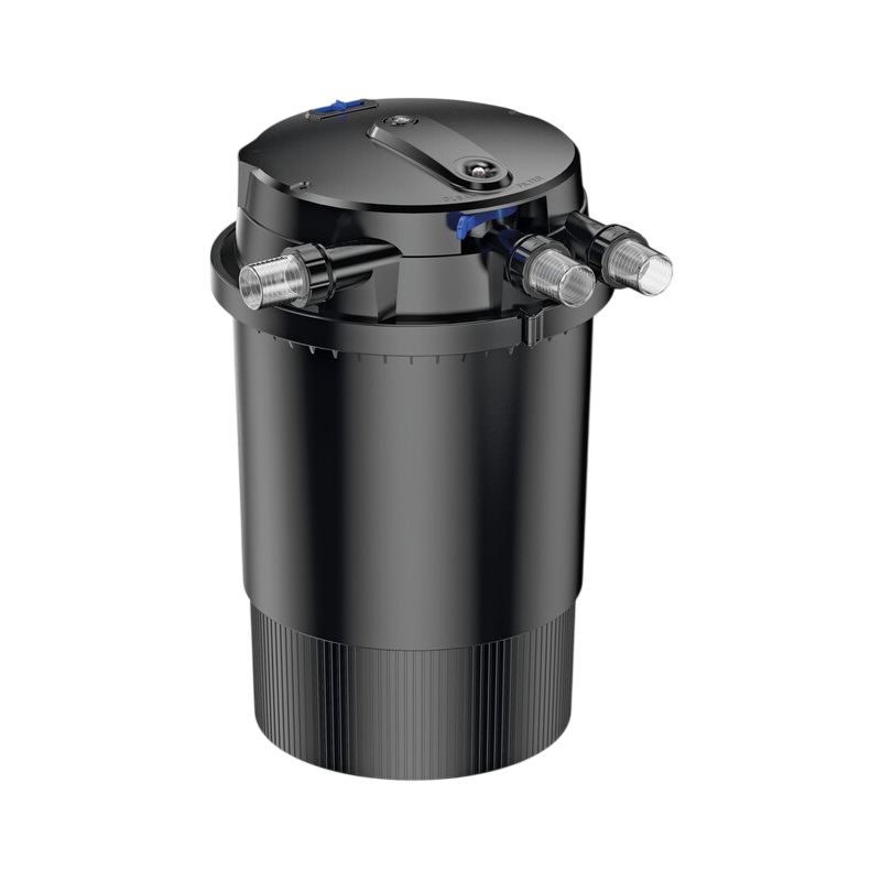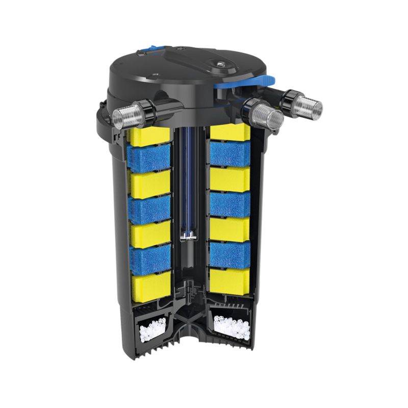Le TopClear Pro est un filtre sous pression professionnel 2 en 1 pour bassin, doté d'un grand volume de filtration, d'un puissant UVC de 55 W et d'un système de nettoyage automatique du filtre. Il convient aux bassins allant jusqu'à 36000 litres. Filtre sous pression autonettoyant pour bassin, pour une installation pratique et une filtration optimale. Fourni avec une minuterie UVC (24/12/0 heures) économe en énergie : elle permet de régler le nombre d'heures de fonctionnement de la lampe UV, par exemple 12 heures au printemps et à l'automne, 24 heures en été et 0 heure en hiver, ce qui permet d'économiser de l'énergie lorsque l'UVC n'est pas nécessaire et de prolonger la durée de vie de la lampe UV. Filtration optimale grâce à une grande chambre de filtration de 75 litres avec 7 couches de mousse filtrante (grosse/bleue et fine/jaune) pour la filtration mécanique et des Bio-Balls pour la filtration biologique. L'indicateur de saleté dans le couvercle signale quand le filtre doit être nettoyé. Nettoyage facile grâce au système de nettoyage automatique : le pack de mousse filtrante est essoré et l'eau sale s'écoule par le drain. Convient aux bassins allant jusqu'à 36000 litres, fourni avec un puissant UVC de 55 W avec minuterie.