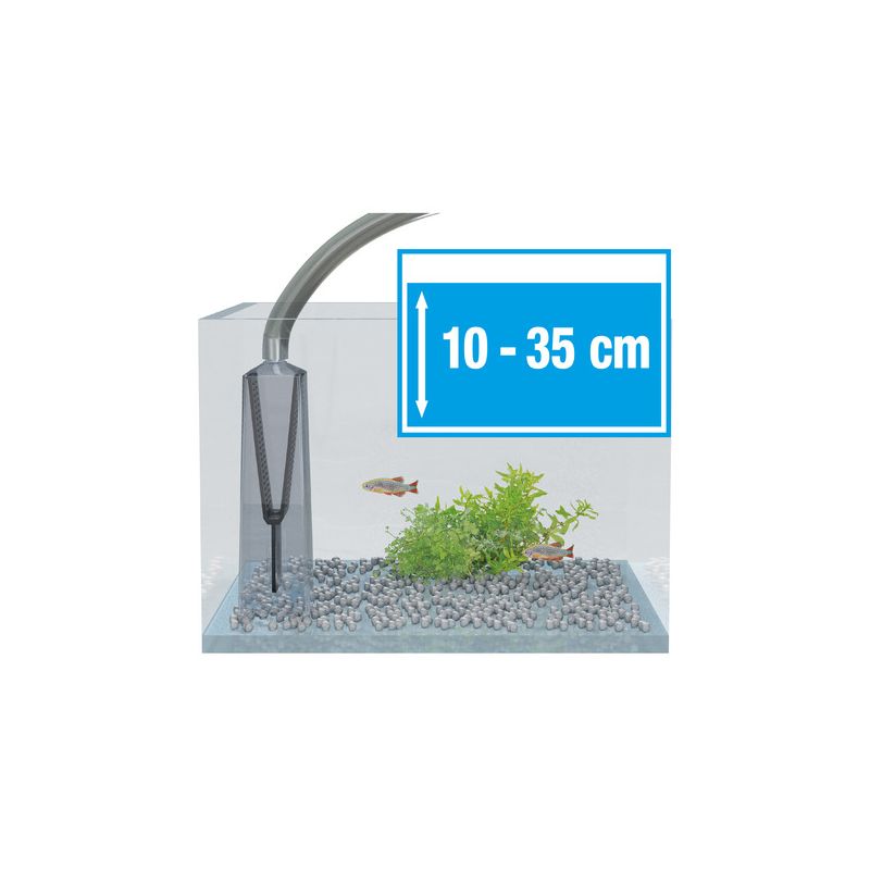 Utilisation : tenir la cloche à vase dans l'eau, amorcer une fois brièvement l'aspiration au tuyau, l'eau coule dans le seau. Plonger la cloche à vase dans le substrat de sol pour en aspirer les impuretés.