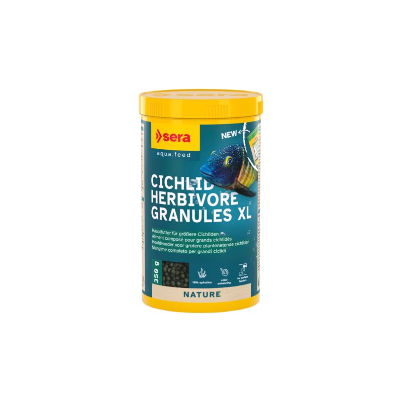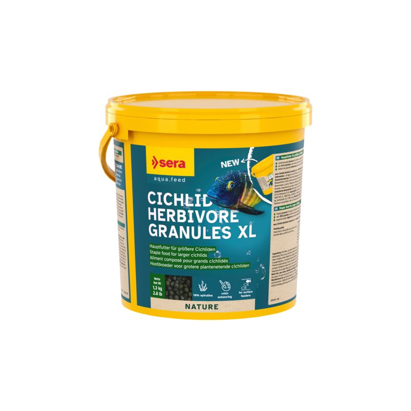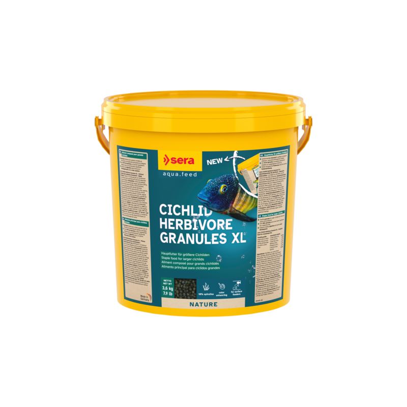 sera Cichlid Green XL est l’aliment composé à base de granulés fabriqués selon un procédé spécial, pour les grands Cichlidés principalement herbivores et mangeurs d’algues et pour d’autres grands poissons. Grâce à la haute teneur en algues spiruline (10 %) et à d’autres précieux éléments végétaux, tels que l’épinard, cet aliment favorise, avec ses caroténoïdes, minéraux et fibres, l’éclat optimal des couleurs, une bonne digestion et le développement. Les granulés flottants conservent longtemps leur forme et ne polluent pas l’eau.