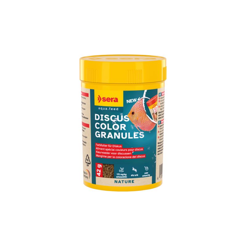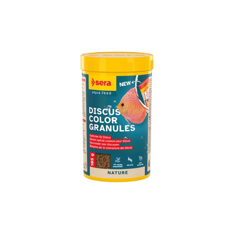 sera Discus Color Nature est l’aliment spécial couleurs sans colorants ni conservateurs à base de granulés moelleux fabriqués selon un procédé spécial, pour tous les discus.