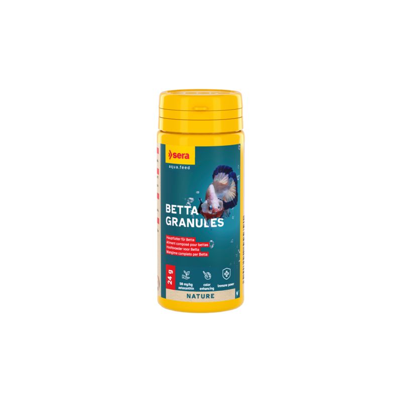 sera Bettagran est l’aliment spécial couleurs, très digeste, à base de granulés fins fabriqués selon un procédé spécial, pour tous les poissons se nourrissant dans les couches moyennes de l’eau, p. ex. les superbes Combattants. Grâce à ses ingrédients de haute qualité, tels que les algues Haematococcus, cet aliment favorise, de façon naturelle et ciblée, le développement des couleurs et renforce les défenses naturelles. Les granulés moelleux, descendant lentement au fond, se ramollissent rapidement dans l’eau, tout en conservant longtemps leur forme, et ne polluent pas l’eau.