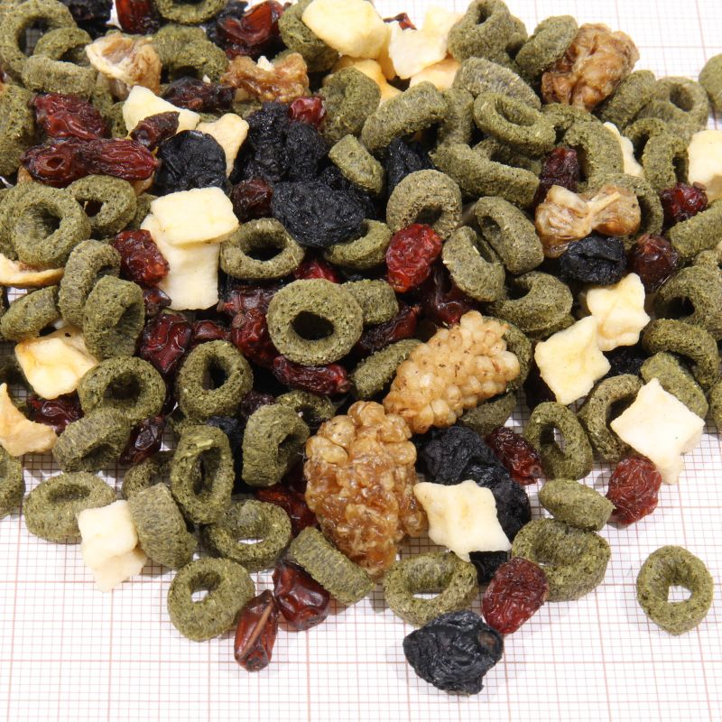 Mélange équilibré de fruits à l’état naturel et de rondelles purement végétales (diamètre env. 1 cm, avec fruits et luzerne, épinard, betterave, thym, basilic et autres herbes), car le mélange génère une alimentation adaptée à l'espèce.