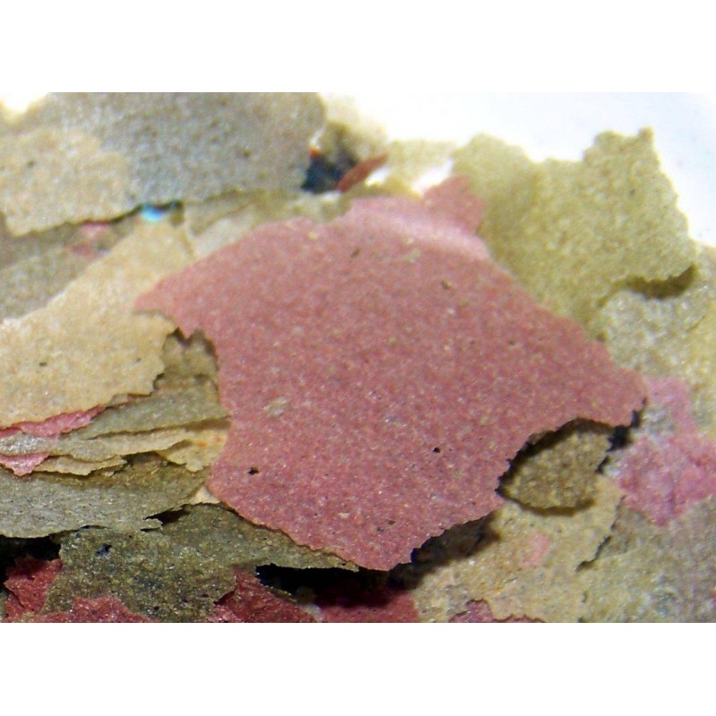 Aliment complet équilibré pour poissons tropicaux en flocons. Bonne conservation à l'abri de l'humidité, intéressant pour grands consommateurs de nourriture.