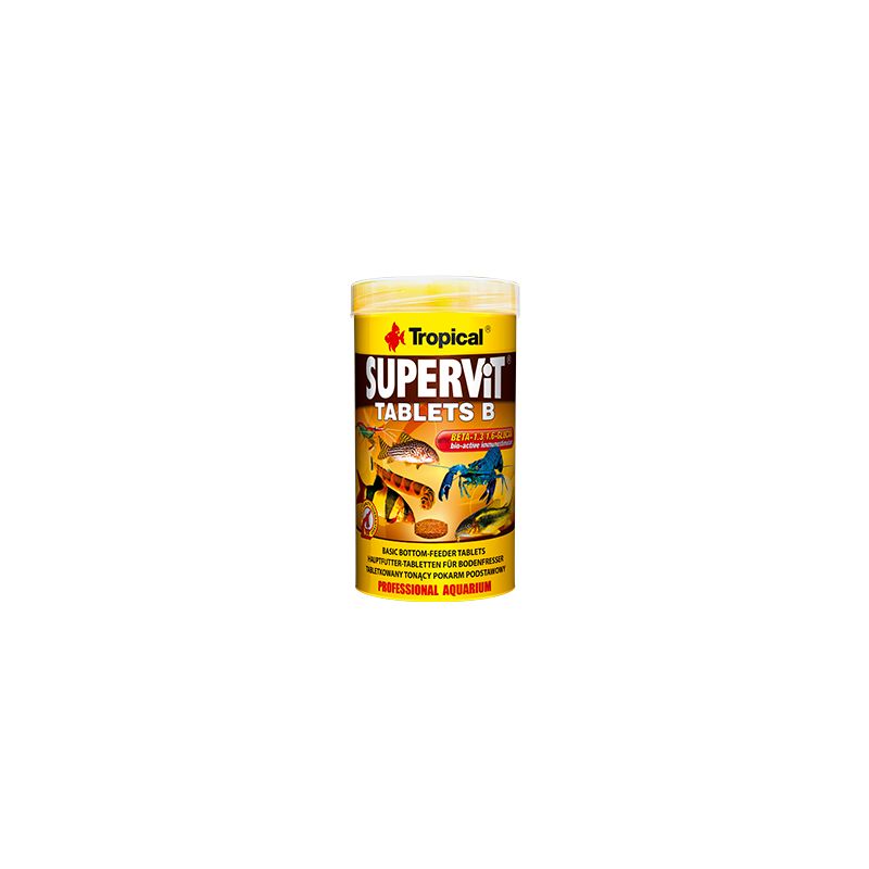 SUPERVIT TABLETS B tablettes de base adhésives pour mangeurs dans le fond, avec beta-glucan Tablettes adhésives à multi ingrédients pour mangeurs dans le fond, pour l’alimentation quotidienne de poissons omnivores et carnivores mangeant dans le fond, tels que mangeurs d’algues, Corydoras et autres poissons-chat, y compris des spécimens de grande taille. SUPERVIT TABLETS B est également destiné aux crustacés, escargots et tortues aquatiques. Le beta-glucan, un stimulateur de l’immunité et la vitamine C stabilisée rehaussent le système immunitaire et aident à combattre les pathogènes. Une vaste gamme d’ingrédients de la meilleure qualité soigneusement sélectionnés, complétée par des vitamines et oligo éléments optimalement balancés comblent les besoins nutritifs et énergiques de toutes espèces de poissons, même les plus exigeants. La formule riche en ingrédients de SUPERVIT TABLETS B en fait une solution parfaite pour les aquariums hébergeant plusieurs espèces. Cette nourriture est également disponible en différentes formes: Supervit, Supervit Granulat, Supervit Chips, Supervit Mini Granulat, Supervit Tablets A