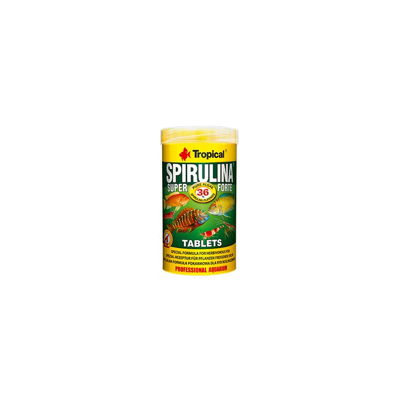 SUPER SPIRULINA FORTE TABLETS Tablettes végétales adhésives à haute teneur (36%) en algues Spirulina platensis pour jeunes cichlidés africains mangeurs d’algues et pour autres poissons, y compris quelques espèces d’eau de mer, ayant besoin d’une quantité considérable de substances végétales dans leur régime. Spirulina platensis renforce le système immunitaire et a un effet bénéfique sur les processus de la digestion. C’est une source d’acides gras insaturés, de protéines aisément assimilables riches en acides aminés exogènes, de vitamines et d’oligo éléments assurant une croissance intense et une condition et vitalité excellentes. La présence de caroténoïdes dans spirulina assure des couleurs magnifiques chez les poissons nourris régulièrement avec SUPER SPIRULINA FORTE TABLETS