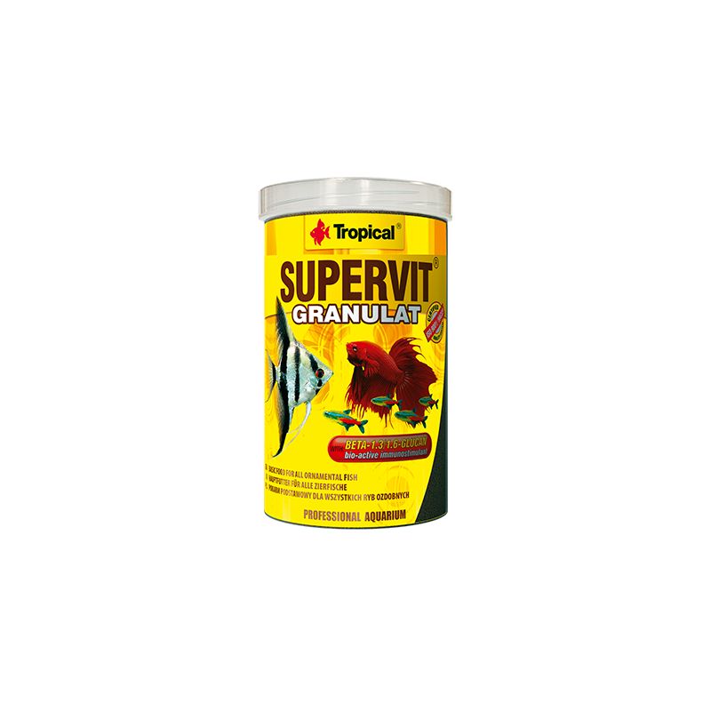 SUPERVIT GRANULAT est une nourriture granulée complète à multi ingrédients de la meilleure qualité pour l’alimentation quotidienne de tous poissons d’aquarium. La nourriture contient le stimulateur immunitaire naturel BETA 1,3/1,6 GLUCAN et de la vitamine C stabilisée rehaussant effectivement le système immunitaire des poissons, les protégeant ainsi contre plusieurs infections. La cellulose et la chitine améliorent la digestion et préviennent la constipation, les caroténoïdes rehaussent les couleurs et la lécithine augmente la vitalité et stimule le frayage.