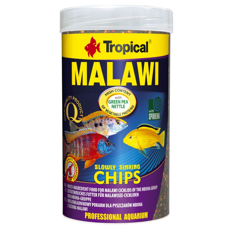 MALAWI CHIPS est une nourriture à multi-ingrédients sous forme de petites chips descendant lentement pour cichlidés Malawi du groupe Mbuna et autres cichlidés herbivores. Une formule diversifiée assure aux poissons une condition excellente et une splendide coloration. La taille et la forme des chips sont ajustées à la bouche des poissons et stimulent donc leur appétit et une mastication appropriée. Fibres et orties règlent la digestion. La nourriture contient plusieurs sources de protéines végétales aisément assimilables, telles que pois verts et spirulina. Les algues Kelp (Ascophyllum nodosum), riches en sels minéraux naturels (y compris iode) ainsi que les vitamines améliorent l'immunité des poissons. Des germes de froment fournissent les acides gras nécessaires. L'addition de L-carnitine régule le métabolisme des tissus adipeux.
