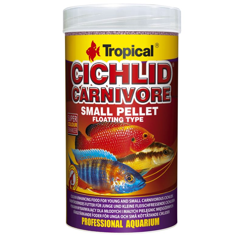 CICHLID CARNIVORE SMALL PELLET Nourriture riche en protéines avec astaxanthine pour cichlidés carnivores jeunes ou de petite taille, p.e.: Cyphotilapia afra, Placidochromis electra, Hemichromis bimaculatus. Les granules flottantes sont fabriquées selon la technique HTST, grâce à laquelle elles sont exceptionnellement assimilables, sûres au point de vue biologique tout en ne se désagrégeant pas dans l’eau. Utilisé régulièrement CICHLID CARNIVORE assure une condition excellente des poissons tandis que l’astaxanthine additionnée rehausse la coloration.