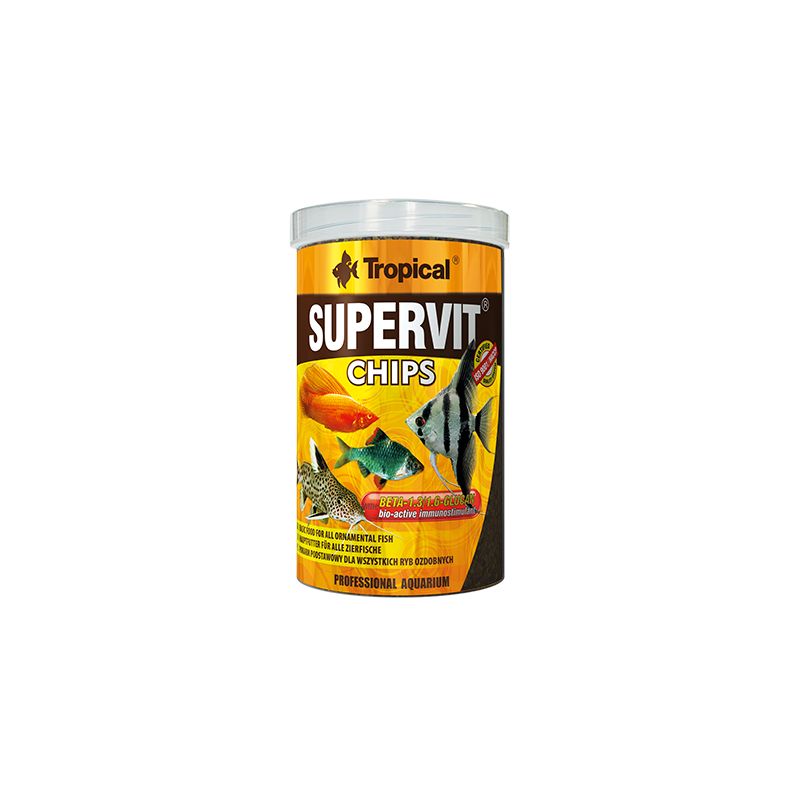 SUPERVIT CHIPS chips descendants à multi ingrédients avec bêta-glucan SUPERVIT CHIPS sont des chips descendants à multi ingrédients pour l'alimentation quotidienne de la plupart des espèces de poissons omnivores mangeant dans le fond ou au milieu de l'eau. Les besoins nutritifs et énergétiques sont comblés par une formule exceptionnellement riche basée sur quelques douzaines d'ingrédients de la meilleure qualité, y compris des mollusques et des algues. Le système immunitaire et sa capacité à combattre les pathogènes sont facilités par le bêta-glucan et la vitamine C stabilisée. Une formule tellement diversifiée en fait une solution alimentaire parfaite pour les cuves communautaires populaires où elle sert de base pour d'autres suppléments avec des nourritures végétales et riches en protéine, en cas de nécessité.