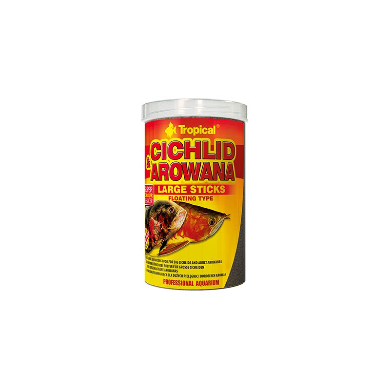 CICHLID & AROWANA LARGE STICKS bâtonnets rehaussant la couleur, avec astaxanthine, pour cichlidés de grande taille et arowanas adultes Bâtonnets flottants à multi ingrédients, rehaussant la couleur, pour l’alimentation quotidienne de cichlidés de grande taille, arowanas adultes et autres grands poissons omnivores et carnivores. CICHLID & AROWANA LARGE STICKS contient un nombre considérable de caroténoïdes naturels, y compris de l’astaxanthine aisément assimilable. Des poissons nourris régulièrement avec CICHLID & AROWANA LARGE STICKS développent une coloration intense et magnifique. Des protéines aisément assimilables et des vitamines et oligo éléments extrêmement bien balancés stimulent la croissance et une excellente condition. De la vitamine C stabilisée et le stimulateur de l’immunité – beta-glucan – renforcent le système immunitaire.