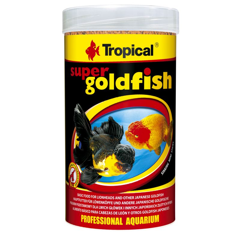 SUPER GOLDFISH MINI STICKS nourriture de base pour tetes de lion et autres poissons rouges japonais Une nourriture complète sous forme de bâtonnets descendant vers le fond pour têtes de lion et autres poissons rouges Japonais. SUPER GOLDFISH MINI STICKS contient tous les ingrédients essentiels, y compris la spirulina et l’astaxanthine rehaussant la coloration. Elle stimule naturellement la croissance de vos poissons et assure une condition optimale, tout en encourageant une forme de tête superbe et une splendide queue voilée.