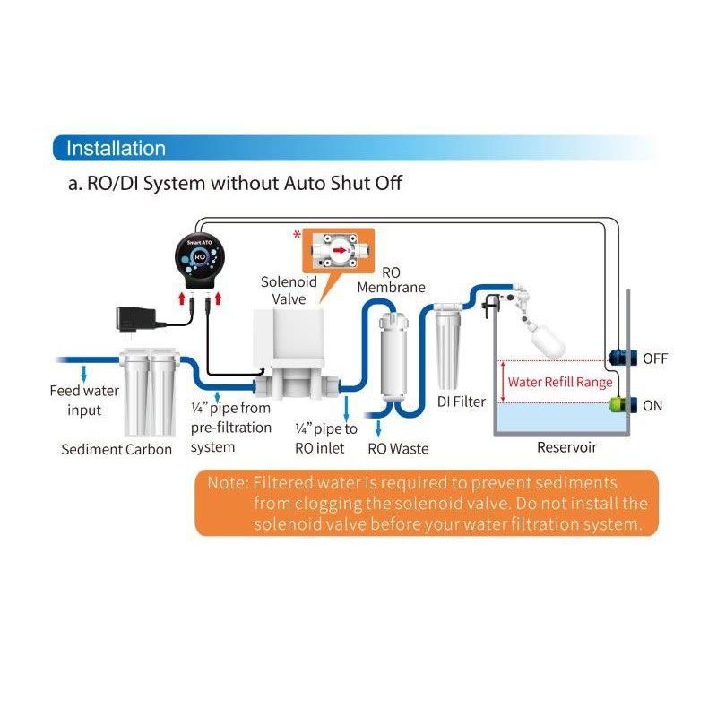 Le Smart ATO RO est un dispositif pour remplir de manière automatique et fiable votre réservoir d'eau osmosée RO ou RO/DI. Dès que le niveau d'eau atteint le capteur de niveau bas du réservoir, le remplissage débute automatiquement pour remplir le réservoir, jusqu'à ce que le capteur de niveau haut soit atteint.