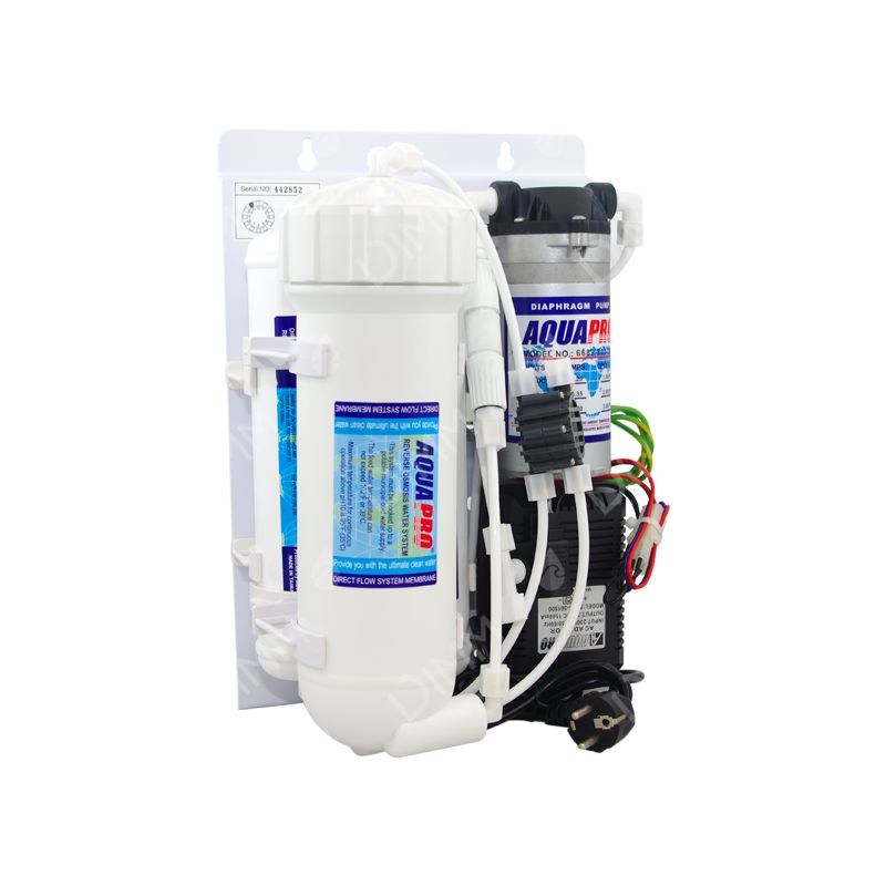 Aquapro (osmose inverse) : Osmoseur Aquariopure - 3 niveaux de filtration - avec membrane 400 GPD (1514 litres/jour) + porte-membrane + pompe booster + transformateur 24 V + shut-off + 1 restricteur de débit + 1 switch basse pression + cartouche en ligne sédiments AIP-25 + cartouche en ligne charbon actif granulé (GAC) AIC-25 + support blanc + 1 raccord robinet 3/4'' + accessoires d'installation (complet prêt à installer).