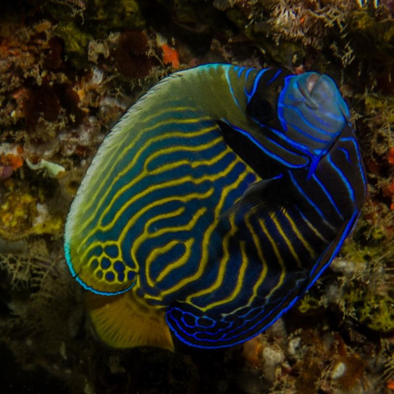 Notes : Même en captivité, les empereurs cherchent et préfèrent le confort d'un abri de roches, des grottes et niches de corail.
