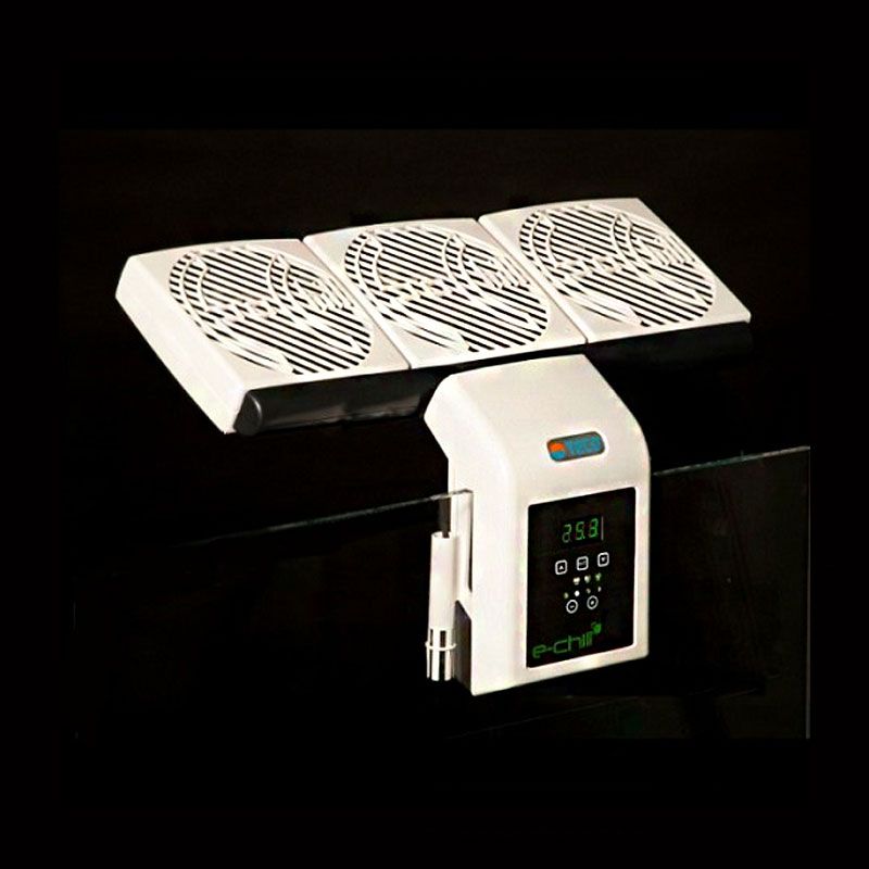 L'utilisation de ventilateurs dans l'aquarium a deux limitations majeures et Teco E-chill ne fait pas exception. La première est que la température dans le réservoir ne peut jamais être très inférieure à la température ambiante, et la seconde que la vitesse d'abaissement de la température elle-même dépend strictement de l'humidité. Les jours de forte humidité, la fonctionnalité d'E-Chill sera réduite au minimum. La synergie avec la glacière peut résoudre ces problèmes en nous permettant de toujours tirer le meilleur des deux mondes. Dans des conditions normales, Echill fonctionne avec une consommation d'énergie extrêmement limitée, mais dans les cas extrêmes, le refroidisseur récupère rapidement la température. La partie électronique est un thermostat chargé d'allumer et d'éteindre les ventilateurs et d'utiliser leur intensité sur trois niveaux, et est connecté à un capteur de niveau qui peut répondre et éteindre complètement l'E-chill pour éviter une évaporation excessive de l'aquarium. pour prévenir. Les sondes présentes sont en fait au nombre de deux, de niveau et de température. Ils sont situés sur les côtés du clip de fixation du verre.