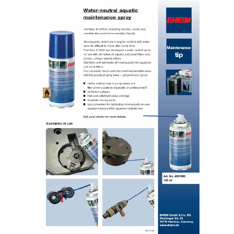 Pour remédier à ces problèmes, EHEIM a mis au point un spray neutre sans CFC, sous forme de bombe, pour application spéciale pour les produits l´aquariophilie, il suffit tout simplement de projeter ce liquide sur la partie concernée et après un court moment, la pièce est de nouveau opérationnelle.
