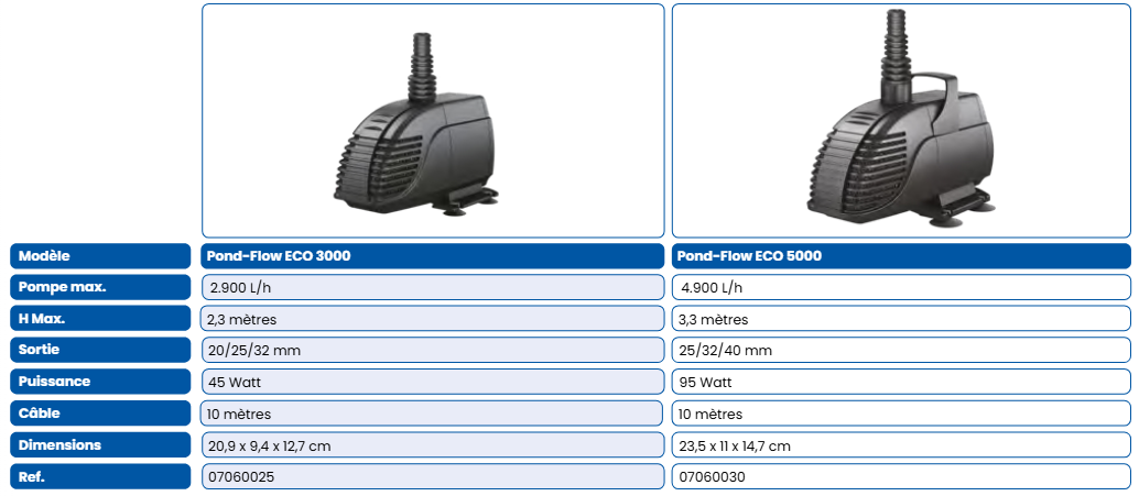 Pompes écoénergétiques et multifonctionnelles, convenant comme pompe de fontaine, de filtration ou pour un cours d'eau ou un ornement aquatique. Disponibles en 5 versions et avec une capacité de pompage de 650, 1000, 2000, 2900 ou 4900 litres par heure. Pompe de bassin économe en énergie pour les fontaines et les filtres de bassin simples. Fourni avec deux buses de refoulement différentes : une fontaine et une boule d'eau, la barre de refoulement est réglable en hauteur et inclinable (15°). Capacité de la pompe 2900 L/h, consommation 45W, hauteur de remontée max. 2,3m, sortie 20/25/32mm, câble de 10 mètres, approbation TUV et garantie de 2 ans, dimensions L x L x H 20,9 x 9,4 x 12,7 cm.