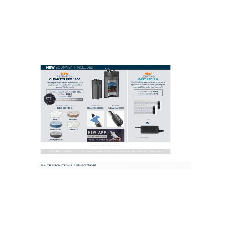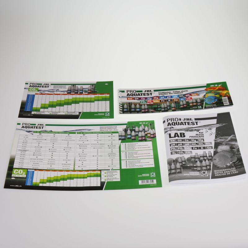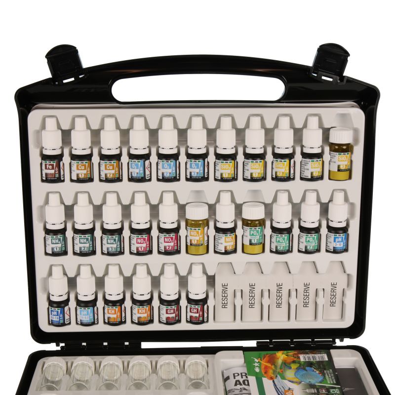 Contrôle facile et sûr des paramètres d'eau en aquarium. Détermination de : pH (3 plages), dureté carbonatée, dureté totale, ammonium/ammoniaque, nitrites, nitrates, phosphates, fer, cuivre, silicates, oxygène. Calcul du CO2 sur tableau.