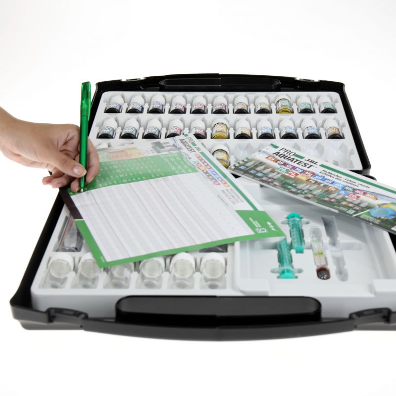 Contenu : 1 coffret de tests, 29 réactifs, 12 éprouvettes en verre, 2 éprouvettes en plastique, 2 seringues, 3 mesurettes, thermomètre, stylo bille, fiches de résultats et d'analyse, système comparatif de laboratoire et mode d'emploi détaillé.