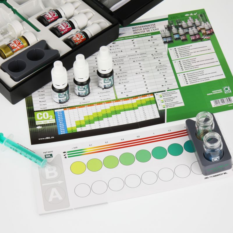 • Compris dans la livraison : 1 coffret de test pour aquariums d'eau douce, 5 réactifs, 3 éprouvettes en verre, seringue, mesurette, bloc comparateur, éprouvette en plastique, nuanciers, feuilles de résultats, mode d'emploi.