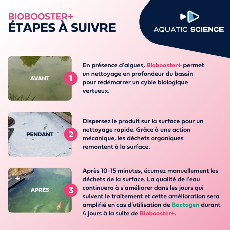 Bien secouer avant chaque utilisation. Le bassin doit être correctement brassé, la filtration adéquate. Dès que la température de l’eau dépasse 14°C, répartir uniformément Biobooster+ sur la surface du bassin. Retirer les déchets qui atteignent la surface. Plus on retire de déchets, meilleur sera le résultat. La formation de mousse est normale et transitoire. L’eau peut prendre un aspect trouble pendant quelques jours. Prolonger le traitement avec du Bactogen durant 4 à 5 jours. Utiliser Biobooster+ de manière régulière en respectant un délai minimum de 15 jours entre deux administrations.