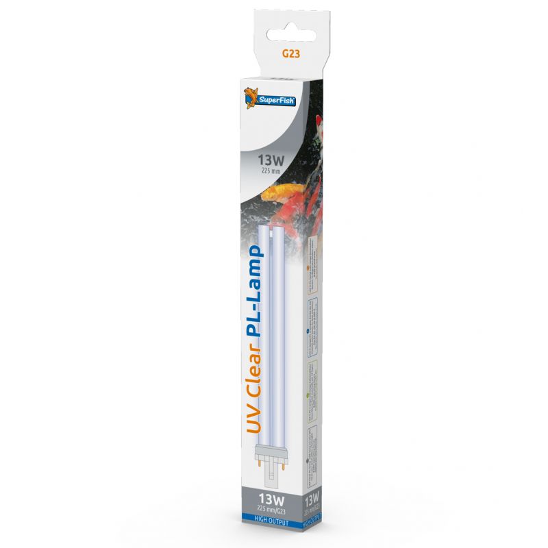 Lampe de remplacement Superfish UV PL avec connexion G23, longueur spéciale 236 mm, pour les filtres Pond Clear 12.000. Cette lampe UV PL a une longueur plus courte que la lampe standard, spécialement pour une utilisation dans des appareils avec un quartz plus court comme le Superfish Pond Clear 12000. Remplacez la lampe UVC chaque année, de préférence au printemps, pour un fonctionnement optimal. Le fait qu'une ampoule brille ne signifie pas qu'elle a encore un rayonnement utile, car le rayonnement UV diminue et n'est plus efficace après 8.000 heures de combustion.