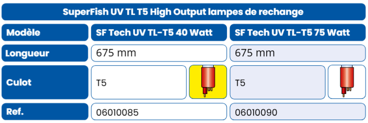 Lampe de remplacement pour les appareils UVC Superfish Alutech T5 de 40 watts. Lampe UV T5 à haut rendement, pour 8000 heures de fonctionnement. Remplacez la lampe UVC chaque année, de préférence au printemps, pour un fonctionnement optimal. Le fait qu'une ampoule brille ne signifie pas qu'elle a encore un rayonnement utile, car le rayonnement UV diminue et n'est plus efficace après 8000 heures de combustion.