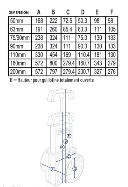 La guillotine est en plastique, sauf sur les modèles 110/160/200 mm, où elle est en acier inoxydable.